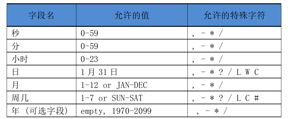“W”字符:指定離給定日期最近的工作日(周一到周五) “#”字符:表示該月第幾個(gè)周 X。6#3 表示該月第 3 個(gè)周五