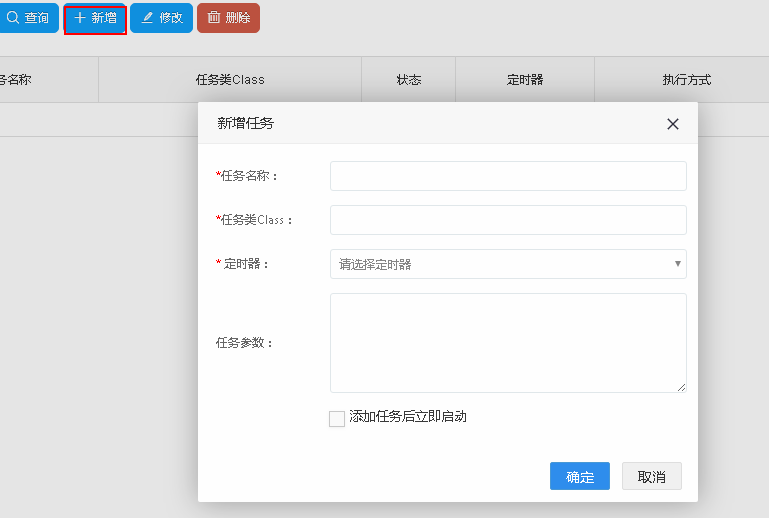 點(diǎn)擊新增按鈕,在新增頁面中填寫任務(wù)名稱、任務(wù)類class、定時(shí)器、任務(wù)參數(shù),并 點(diǎn)擊保存 按鈕完成新增。