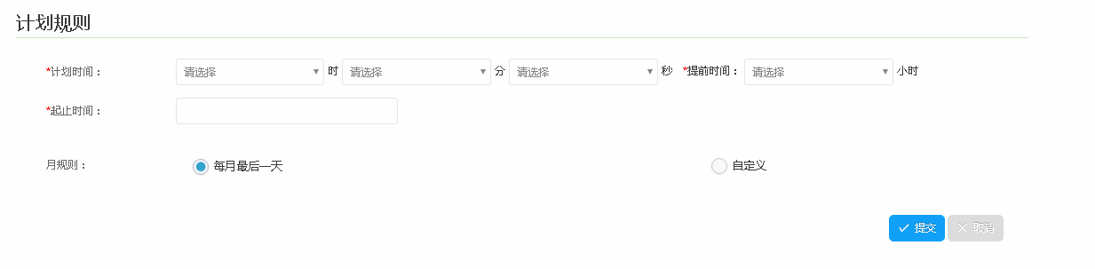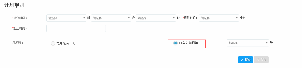 按月:定義每月的觸發(fā)時(shí)間點(diǎn)。通過“每月最后一天”和“自定義”兩種方式進(jìn)行配置?!懊?月最后一天”為觸發(fā)時(shí)間是每月最后一天進(jìn)行觸發(fā),“自定義”是可定義每月的 1 號(hào)至 28 號(hào)自定義觸發(fā)時(shí)間點(diǎn)。
