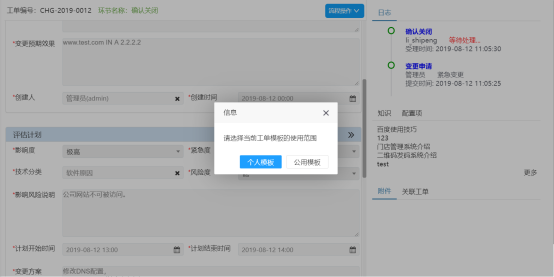 ? 支持變更模板,將標準變更定制為模板調(diào)用,在創(chuàng)建變更時調(diào)用模板快速創(chuàng)建變更