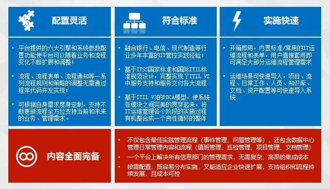 所以,靈活的配置管理和驗(yàn)證功能是我們所關(guān)注的第二個功能。靈活的配置管理和驗(yàn)證功能可以提供多種資產(chǎn)配置數(shù)據(jù)的錄入和導(dǎo)入功能,并同步其他管理流程對資產(chǎn)配置庫的改動數(shù)據(jù),實(shí)現(xiàn)配置管理數(shù)據(jù)的整個生命周期的管理。同時,模板化的定義能力,具備聯(lián)動底層監(jiān)控系統(tǒng)實(shí)現(xiàn)資源同步和檢查機(jī)制,可以發(fā)現(xiàn)和防止配置的隨意修改。