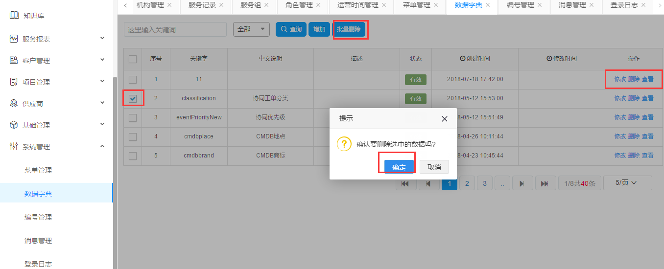 選中目錄,點擊右側(cè)的功能按鈕,可以對字典進行查看、修改、刪除以及批量刪除等操作。