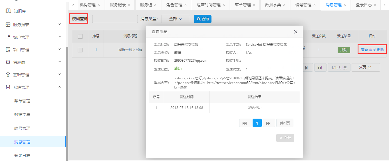 可以通過檢索功能對相應的消息進行查看、重發(fā)、刪除等操作