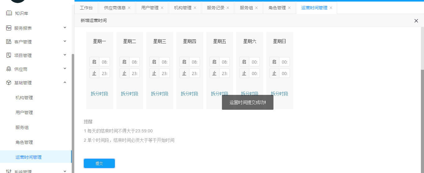 運營時間由工作時間和節(jié)假日組合而成,系統(tǒng)任何設計時間的流程都會參照默認運營時間