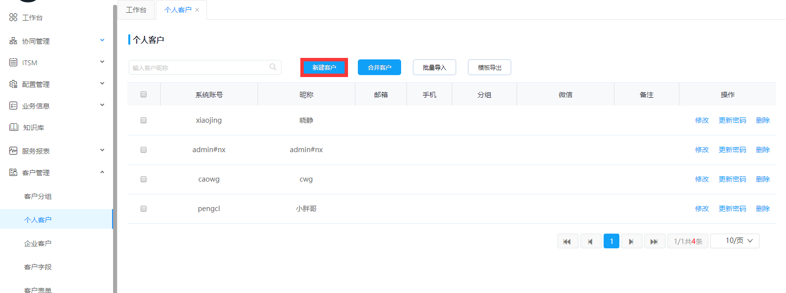 個(gè)人客戶主要是對(duì)用戶個(gè)人的賬號(hào)信息的設(shè)置管理??梢栽O(shè)置賬號(hào),昵稱,郵箱,手機(jī),分組,微信等,并可以進(jìn)行修改密碼,移除用戶等操作。