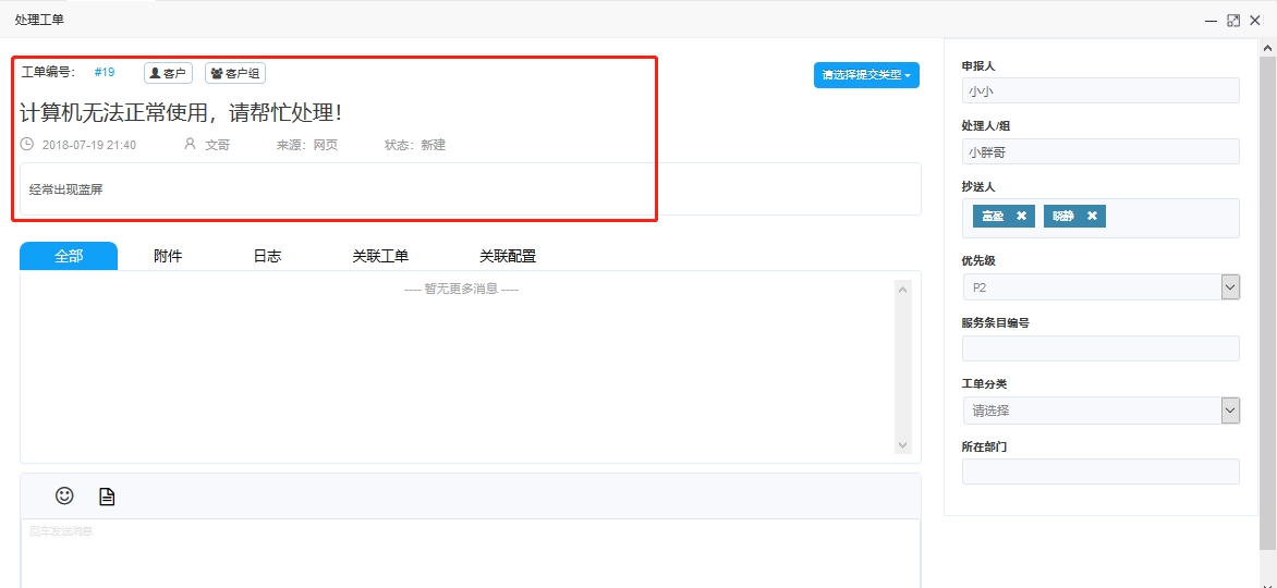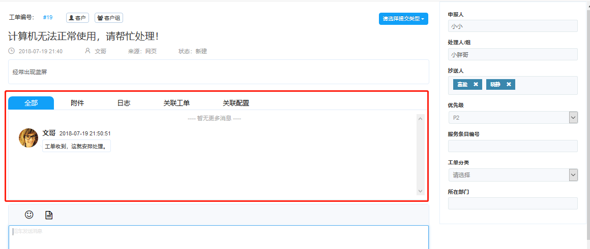消息區(qū):工單詳情下側(cè)為消息區(qū),輸入消息實時溝通。