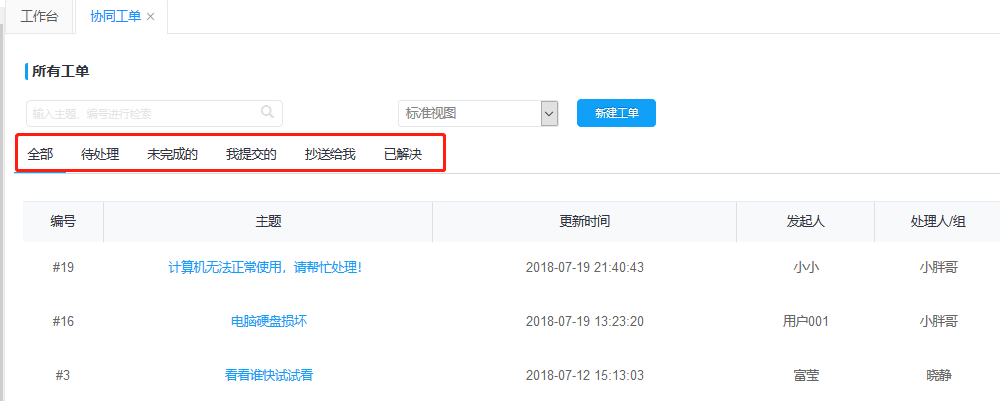 工單隊列分為全部、待處理、未完成、我提交的、抄送給我、已解決,可快速切換標簽查詢到相關(guān)的工單,可同時采用檢索功能查詢需要處理的工單。