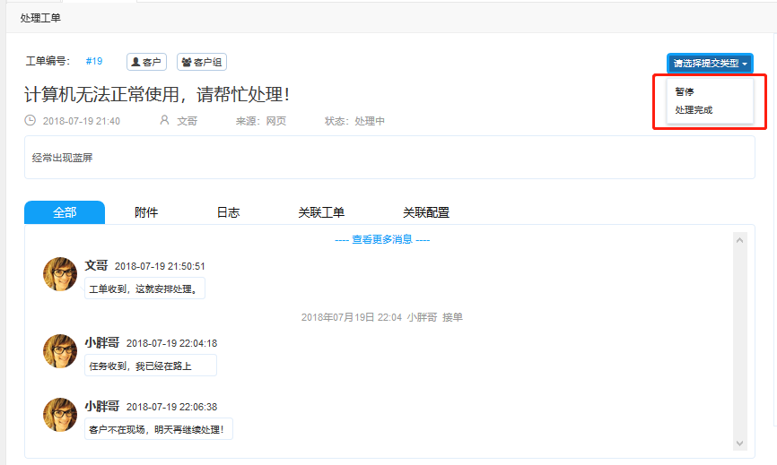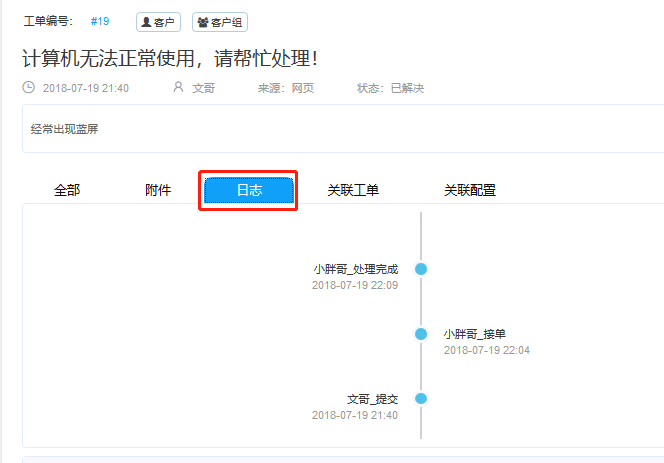 接下來是日志區(qū),包括溝通來往記錄、附件、日志、和關(guān)聯(lián)工單和配置。