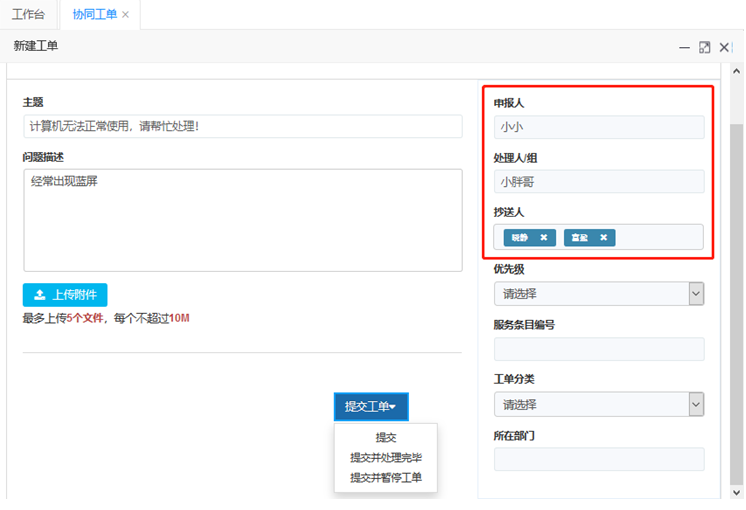 抄送人:將工單抄送給某些人,被抄送人可以參與工單的處理,隨時了解到工單的進度。