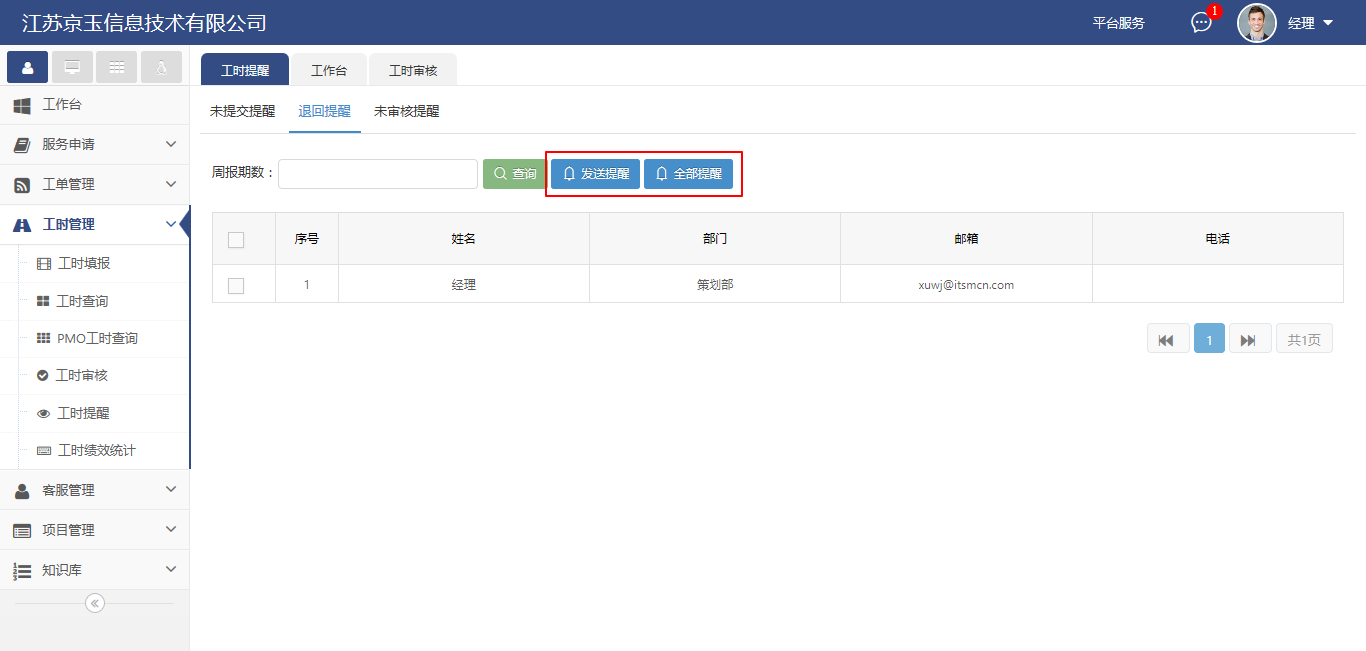 被經(jīng)理駁回工時(shí)的員工都會(huì)出現(xiàn)在回退提醒的列表中,用戶可以勾選未提交用戶,點(diǎn)擊發(fā)送提醒;也可以對(duì)所有被駁回工時(shí)的員工發(fā)送提醒,只需點(diǎn)擊全部提醒