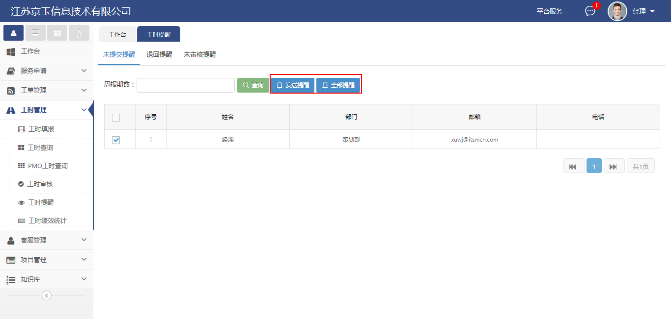 一周內(nèi)沒有審核工時(shí)的領(lǐng)導(dǎo)都會(huì)出現(xiàn)在未審核提醒的列表中,用戶可以勾選未提交用戶,點(diǎn)擊發(fā)送提醒;也可以對(duì)所有未審核工時(shí)的領(lǐng)導(dǎo)發(fā)送提醒,只需點(diǎn)擊全部提醒