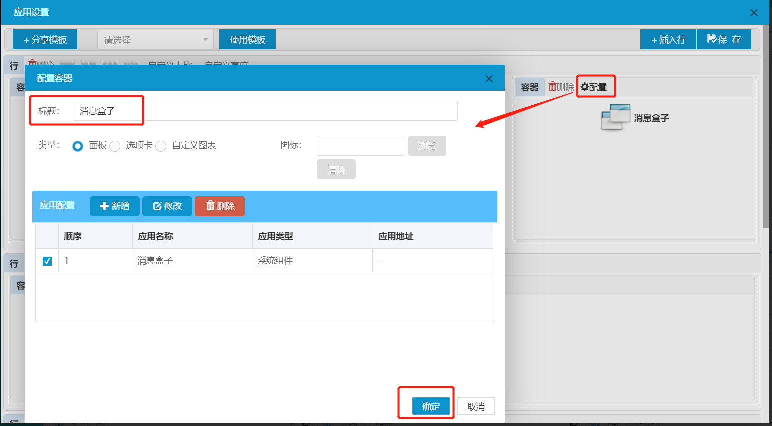 通過管理員【應(yīng)用管理】,進(jìn)入應(yīng)用設(shè)置頁(yè)面,通過對(duì)工作臺(tái)顯示內(nèi)容進(jìn)行配置,在彈出的窗口字段填入消息盒子即可完成配置