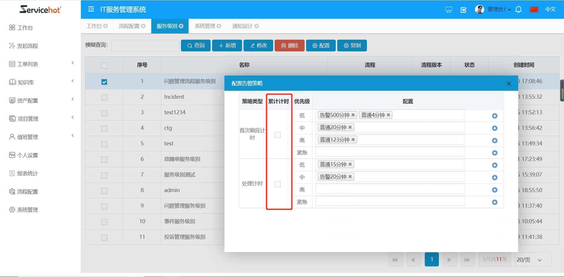 在【流程配置-服務(wù)條目】中選擇已經(jīng)配置好的服務(wù)級別告警。