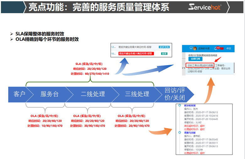 通過ITIL流程實現(xiàn)服務請求流程、故障流程、問題流程,全面實現(xiàn)所有服務流程化、規(guī)范化的高效管理,通過請求、事件、問題層層升級,實現(xiàn)根因的主動解決,改變被動救火的服務現(xiàn)狀;并結(jié)合服務目錄、服務級別(SLA)、運營級別(OLA),對請求和事件的全面和精細化管理,對服務臺工程師、現(xiàn)場工程師的異常工單提供層層告警監(jiān)控,避免工單被人為耽誤。
