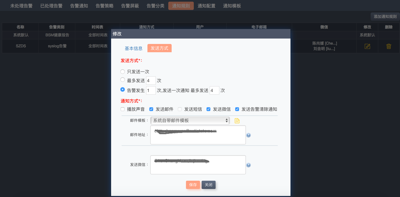 報(bào)警通知策略支持按事件分類發(fā)送到系統(tǒng)用戶/用戶組,也支持手工填寫系統(tǒng)帳號以外的郵件地址和手機(jī)號碼。