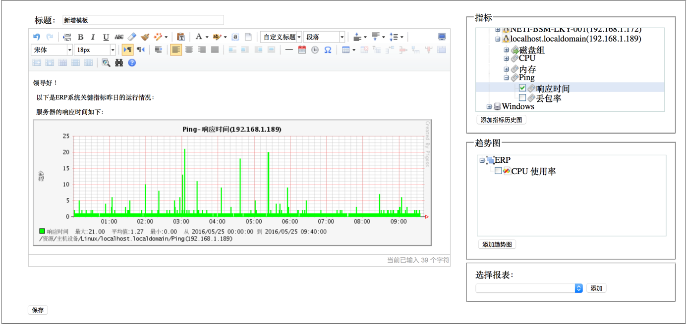 用戶在報(bào)告模板中可以靈活排版,除了自己編寫文字報(bào)告,還可以嵌入動態(tài)的數(shù)據(jù)對象,包括:被監(jiān)控的資源指標(biāo)數(shù)據(jù)、趨勢曲線、已經(jīng)存在的統(tǒng)計(jì)報(bào)表。 系統(tǒng)依據(jù)報(bào)告模板動態(tài)生成的電子運(yùn)維報(bào)告,并以WORD格式呈現(xiàn)和導(dǎo)出。