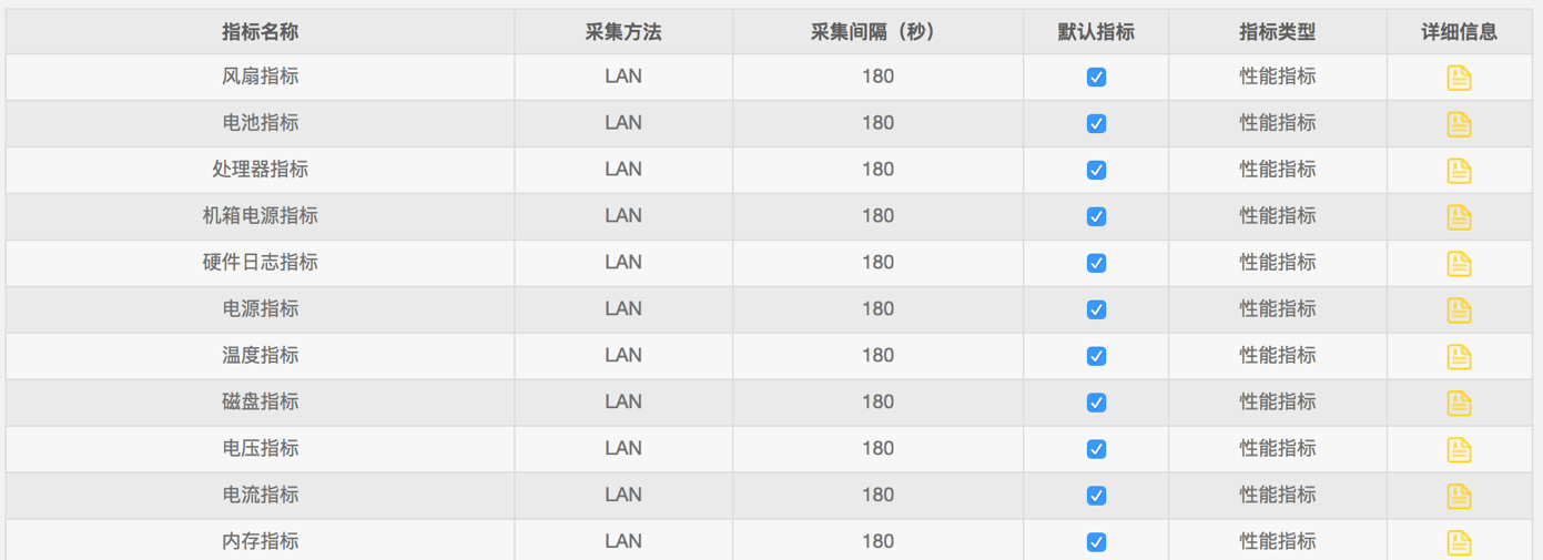 能夠監(jiān)控到的服務(wù)器類型包括:IBM、DELL、HP、ThinkServer、AIX、虛擬化宿主機(jī)服務(wù)器及其他支持IPMI協(xié)議的服務(wù)器。能夠監(jiān)控到的指標(biāo)如下圖所示: