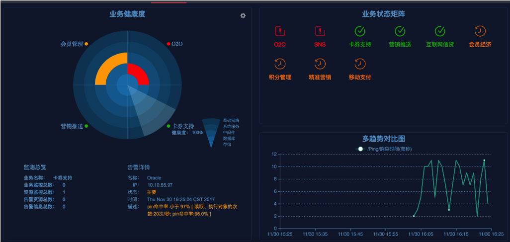 運(yùn)維監(jiān)控系統(tǒng)大屏展現(xiàn)視圖以動態(tài)模式為管理者提供全局業(yè)務(wù)狀態(tài)一覽。業(yè)務(wù)健康度視圖以動態(tài)掃描的方式清晰的呈現(xiàn)業(yè)務(wù)的層級結(jié)構(gòu)以及健康度、故障信息,掃描到的業(yè)務(wù)區(qū)域能夠提供健康度信息、業(yè)務(wù)依賴的資源信息以及告警信息。業(yè)務(wù)狀態(tài)矩陣圖可以批量顯示多個業(yè)務(wù)的基本狀態(tài)信息。趨勢對比圖則很好的展現(xiàn)了核心關(guān)注指標(biāo)的歷史運(yùn)行信息。從整體到局部,運(yùn)維監(jiān)控系統(tǒng)的大屏展現(xiàn)無疑通過管理者的視角為業(yè)務(wù)進(jìn)行了一次健康體檢!