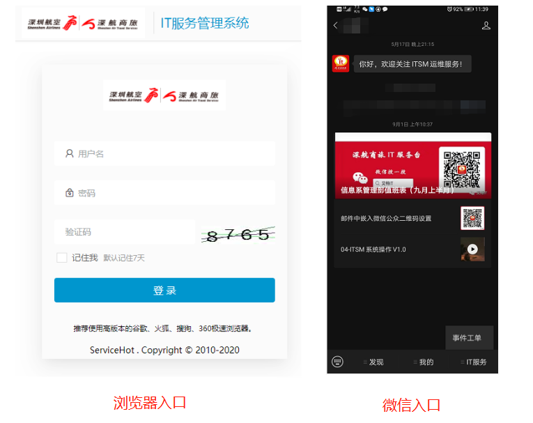 接入多渠道入口和IT應(yīng)用,用戶通過微信服務(wù)號(hào)、郵件渠道、網(wǎng)頁門戶等多樣化的服務(wù)入口,快速提報(bào)事件,查詢服務(wù)過程。集成深航現(xiàn)有的監(jiān)控系統(tǒng),實(shí)現(xiàn)告警自動(dòng)觸發(fā)事件單,通過業(yè)務(wù)系統(tǒng)智能分派事件單給業(yè)務(wù)線負(fù)責(zé)人,無明確業(yè)務(wù)負(fù)責(zé)人的集中到服務(wù)臺(tái)處理。