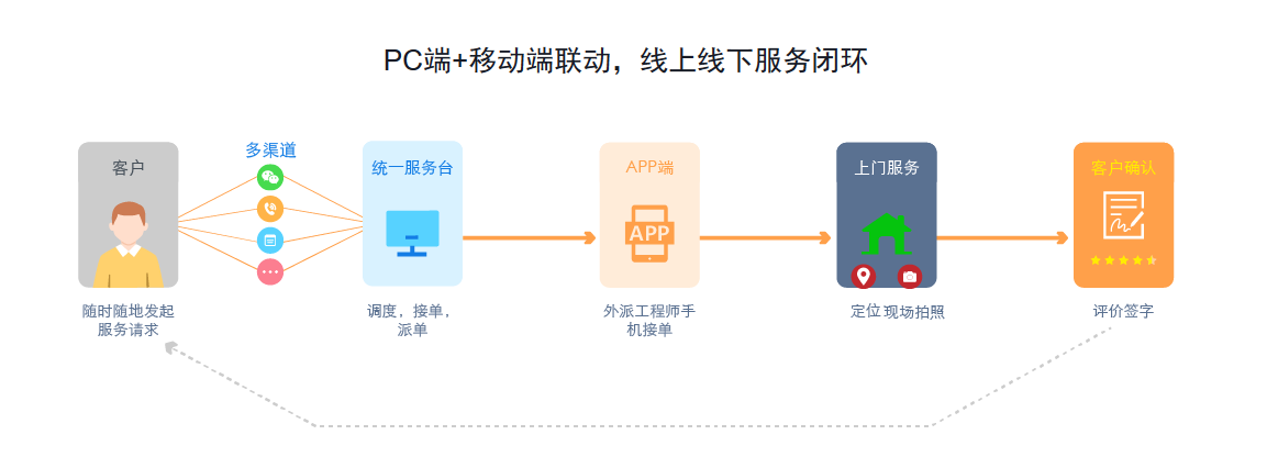 現(xiàn)場(chǎng)服務(wù)管理平臺(tái)可構(gòu)建統(tǒng)一服務(wù)臺(tái),客服中心實(shí)時(shí)掌握現(xiàn)場(chǎng)和工程師的狀態(tài),調(diào)度人員做到心中有數(shù),派單也更準(zhǔn)確合理??蛻舻膮⑴c和積極反饋,改善了現(xiàn)場(chǎng)服務(wù)的透明度,客觀上起到了對(duì)服務(wù)人員的監(jiān)督作用。